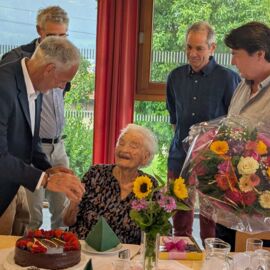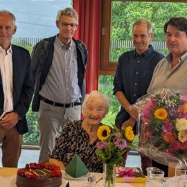 Die Jubilarin genoss die kleine Feier sichtlich mit großer Freude. Auch die Gemeinde ließ es sich nicht nehmen, persönlich zu gratulieren: Bürgermeister Manfred Schafferer und Vizebürgermeister Max Unterrainer überbrachten die besten Wünsche der Gemeinde.