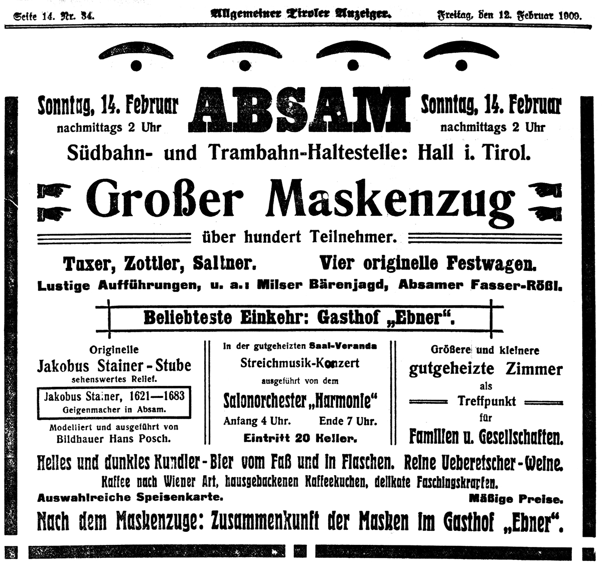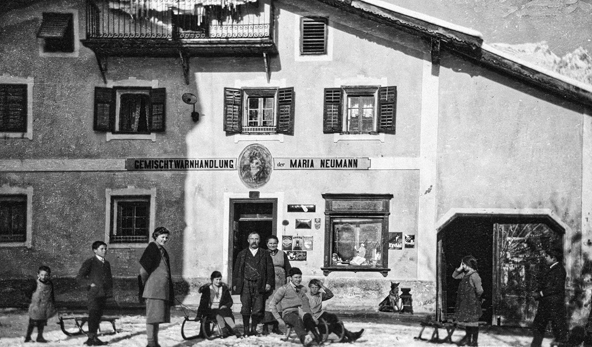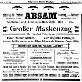 Weiter ging es mit Aufnahmen von historischen Matschgerern bis in das Jahr 1924 zurück als Edi Linser mit dem Motorrad auf das Lafatscherjoch „gebrettert“ ist. Fotos vom Salzberg und eine legendäre Open Air Blinddarmoperation auf Schiern in den 1970er Jahren (wieder im Fasching) rundeten den Rückblick ab. Einige der Besucherinnen und Besucher erkannten sich oder Verwandte auf den Fotos, was noch für viele Gespräche gesorgt hat.