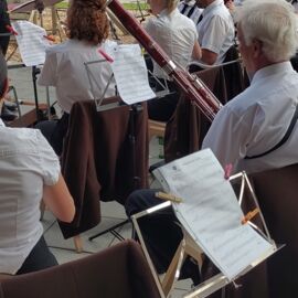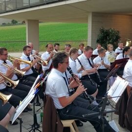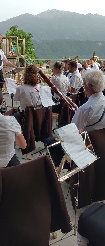 Das Konzert im Haus für Senioren ist mittlerweile zu einer liebgewonnenen Tradition geworden, bei der uns das Wetter fast immer wohlgesonnen ist. Der starke Wind zu Beginn des Konzertes hinderte die wettererfahrenen Musiker nicht, zu spielen. Die Noten wurden mit Wäscheklammern befestigt und der Notenständer während des Musizierens mit dem Fuß festgehalten.