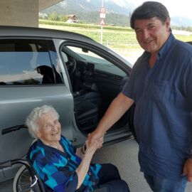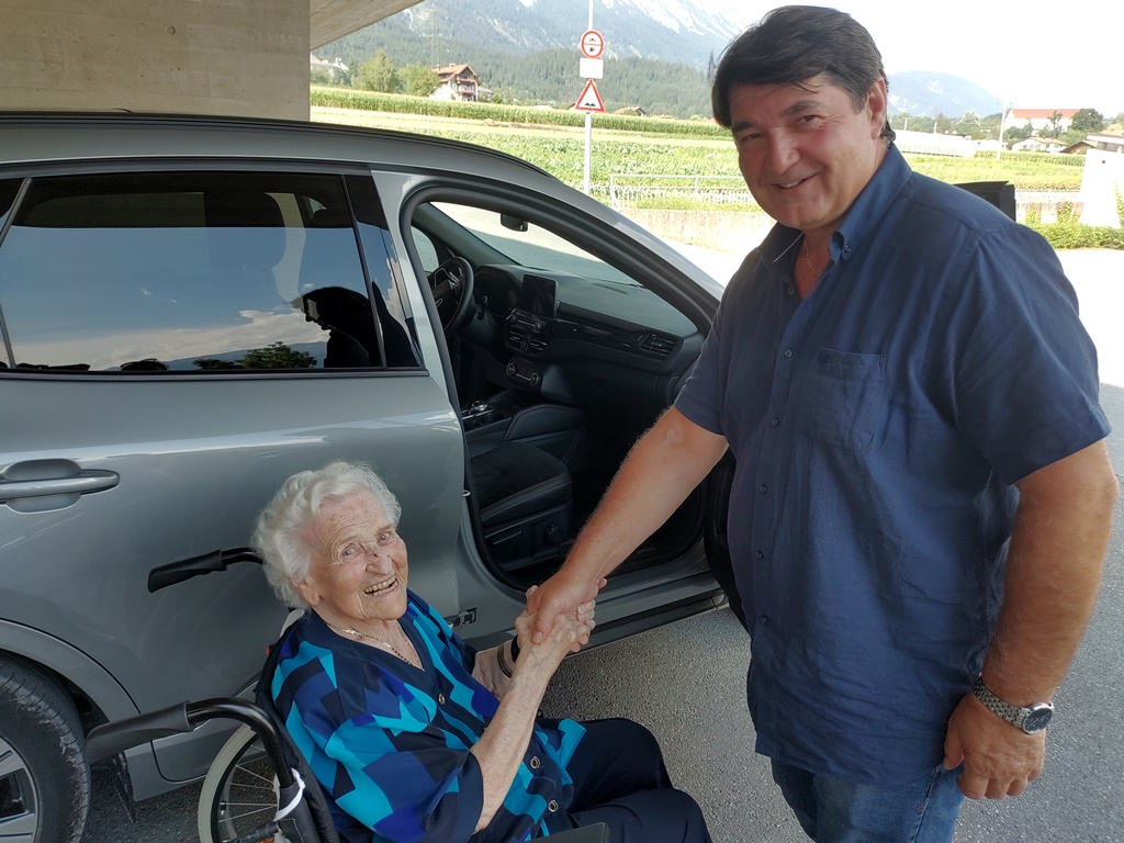 Zum 100. Geburtstag hatte die rüstige Jubilarin diesen Ausflug von der Gemeinde Absam geschenkt bekommen. Nun wurde das Geschenk bei strahlendem Wetter eingelöst. Bürgermeister Manfred Schafferer, Heimleiter Arnold Kreil, ihre Tochter Brigitte, die beiden Enkel Alexandra und Peter sowie ihre Urenkelin Viktoria begleiteten sie auf diesem besonderen Ausflug.