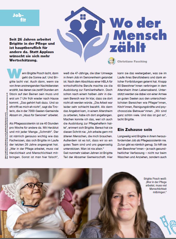 40 Stunden die Woche ist sie hier für andere da. Mit Leib und Seele. Mit Herzblut und mit jeder Menge „Schmäh“. Der ist nämlich genauso wichtig, wie das Fachwissen, das sich Brigitte im Laufe der letzten 26 Jahre angeeignet hat. „Wer in der Pflege arbeitet, muss viel Herzlichkeit und Menschlichkeit mitnehmen: Sonst ist man hier falsch“, weiß die bekennende Menschenfreundin, die über Umwege in ihrem Job im Altersheim gelandet ist. Nach dem Abschluss einer HBLA für wirtschaftliche Berufe machte sie die Ausbildung zur Familienhelferin. Doch schon nach einem halben Jahr in diesem Bereich war ihr klar, dass sie dort nicht alt werden würde. „Die Arbeit war leider sehr schlecht bezahlt. Als dann das Angebot kam, in einem Altersheim anzufangen, hab‘ ich umgedacht und dort angefangen. Machen konnte ich das, weil ich auch die Ausbildung zur Pflegehelferin hatte“, erinnert sie sich. Bereut hat sie diesen Schritt nie. „Ich arbeite gern mit und an älteren Menschen, die mich brauchen. Außerdem ist es toll, dass wir so ein gutes Team sind und uns gegenseitig unterstützen. Man ist nie allein“, sagt Brigitte, die seit nunmehr sieben Jahren Teil der Absamer Gemeinschaft ist. Es ist das dritte Heim, in dem sie arbeitet und wo sie das weitergeben kann, was sie im Laufe ihres Berufslebens und dank etlicher Fortbildungen gelernt hat. Auf zwei Stöcken verbringen hier knapp 60 BewohnerInnen ihren Lebensabend. Unterstützt werden sie dabei von einer Armee an guten Seelen aus den unterschiedlichsten Bereichen. Das Altersheim am Laufen halten nämlich nicht nur die emsigen PflegerInnen, sondern auch die nicht minder untätigen KöchInnen, HauswirtschafterInnen, Reinigungskräfte oder psychosozialen BetreuerInnen. „Wir sind ganz schön viele. Und das ist gut so“, lacht Brigitte. ...