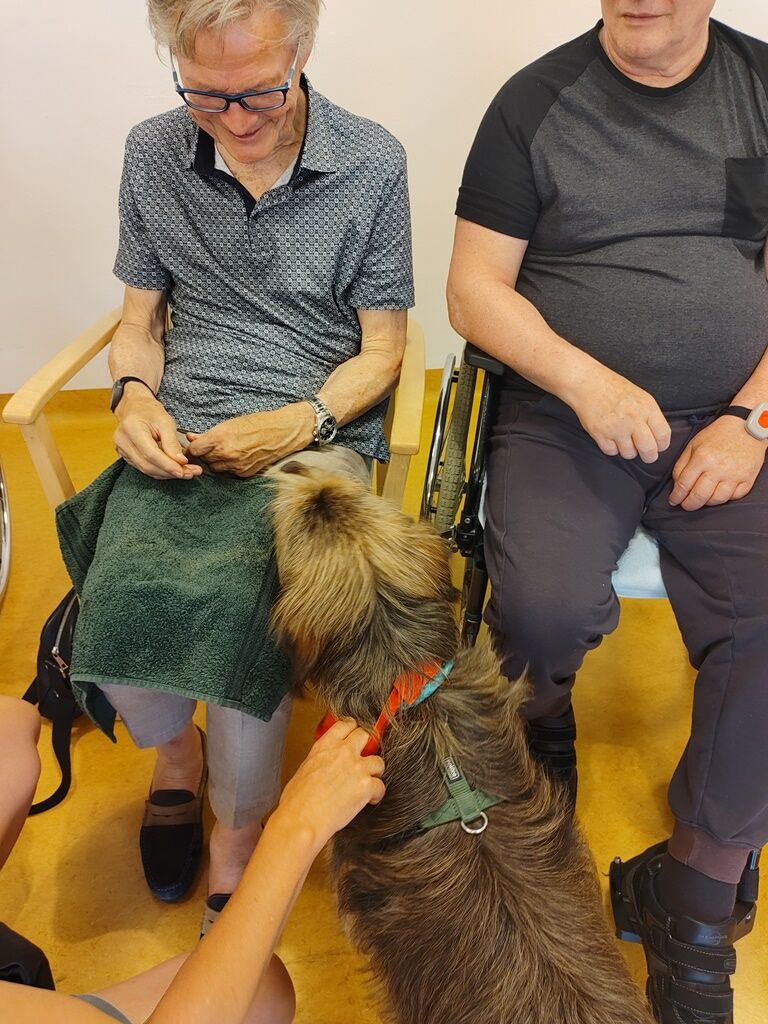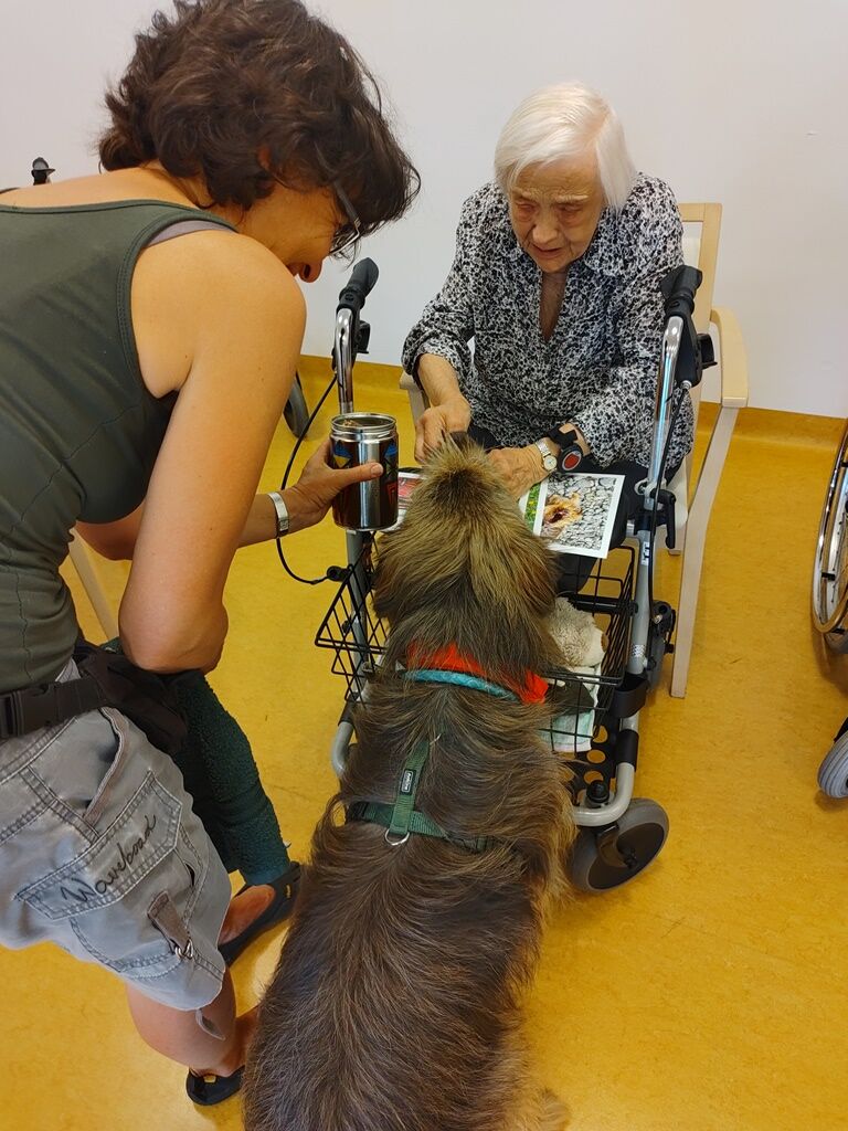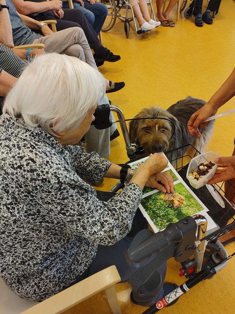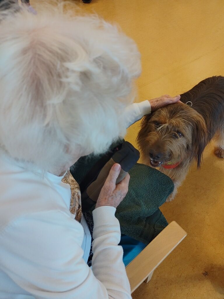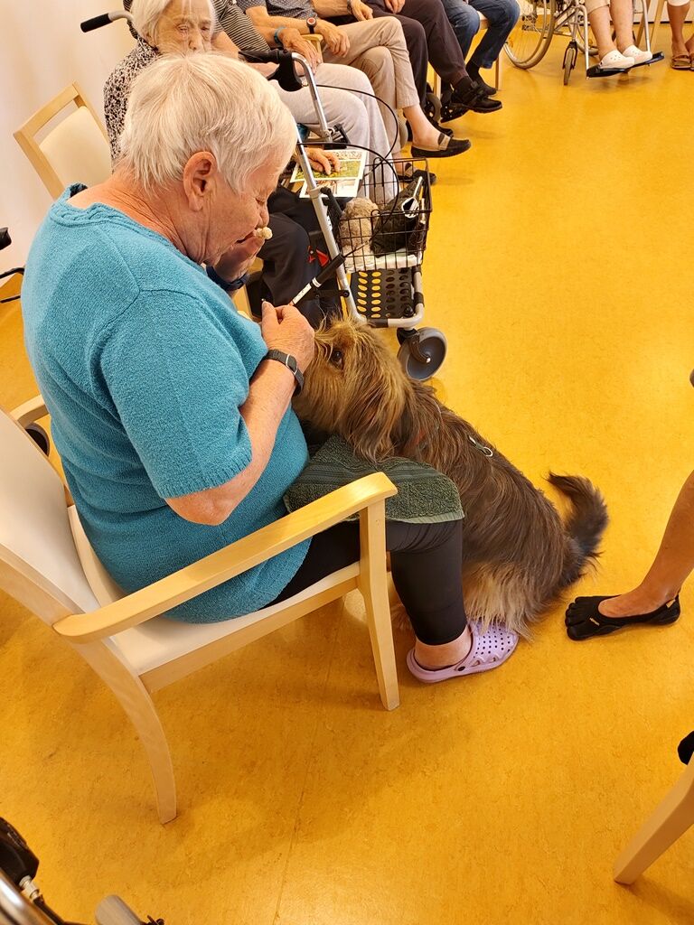 Sie erläuterte auch Ossis vielfältigen Aufgaben einschließlich seiner Ausbildung zur Personensuche. Unsere Bewohner waren deutlich begeistert und hatten viel Spaß mit dem liebenswerten und haarigen Besucher.