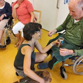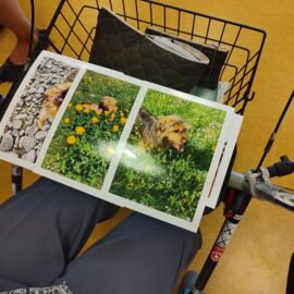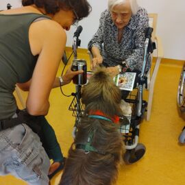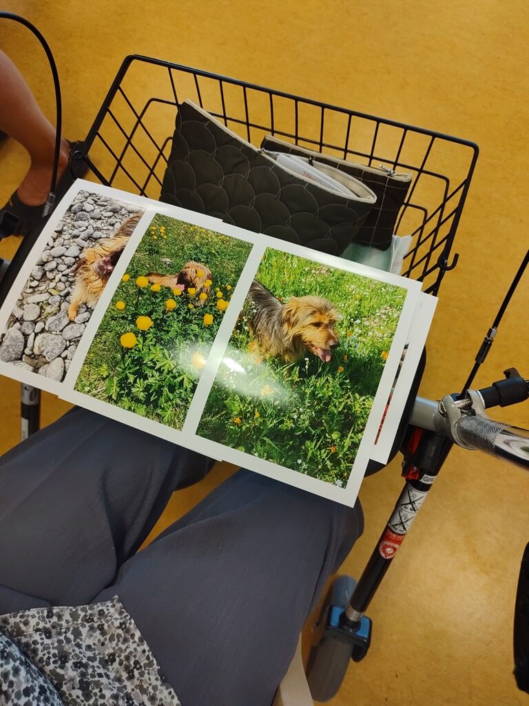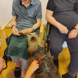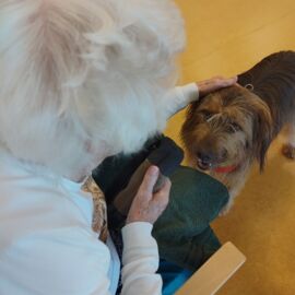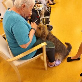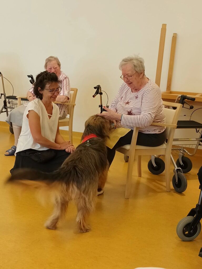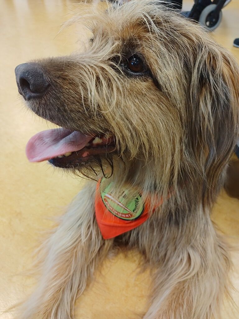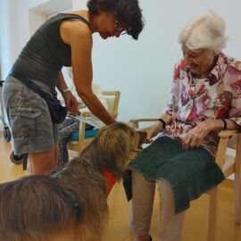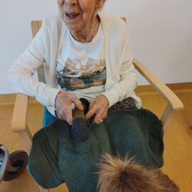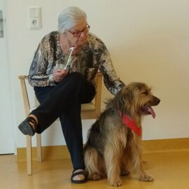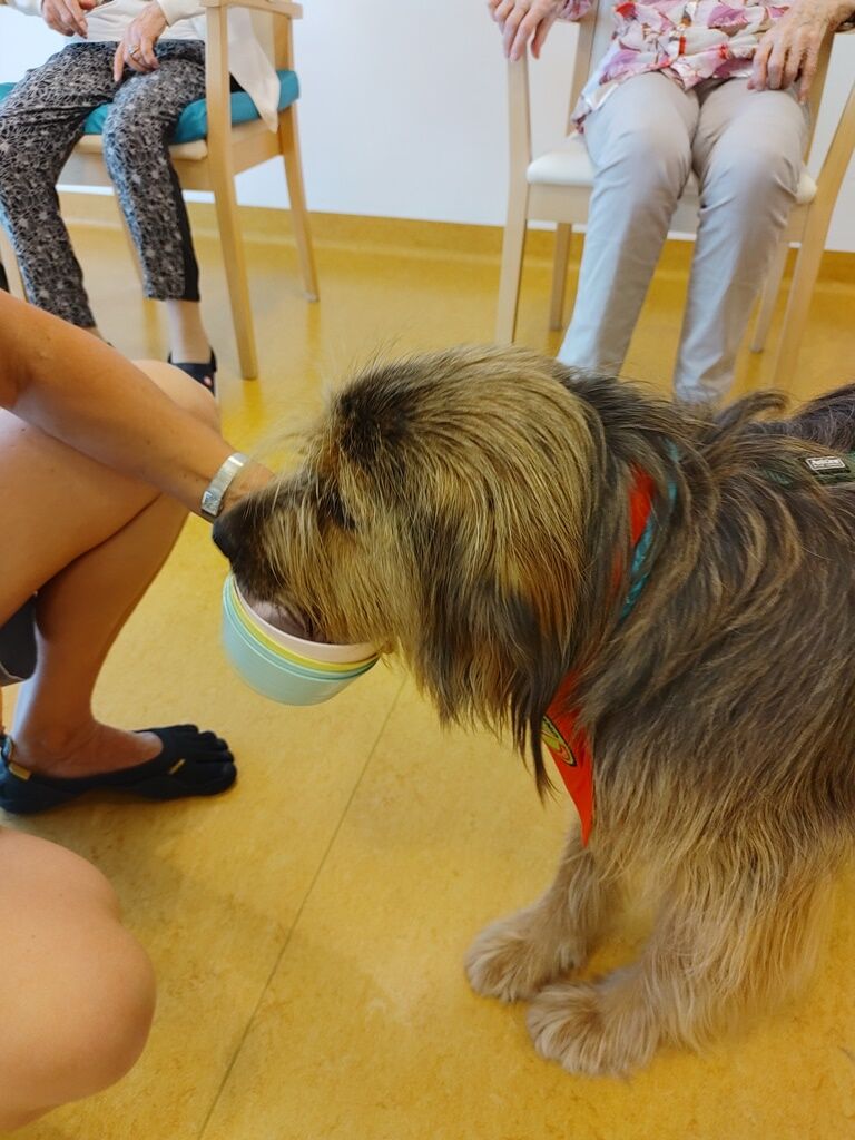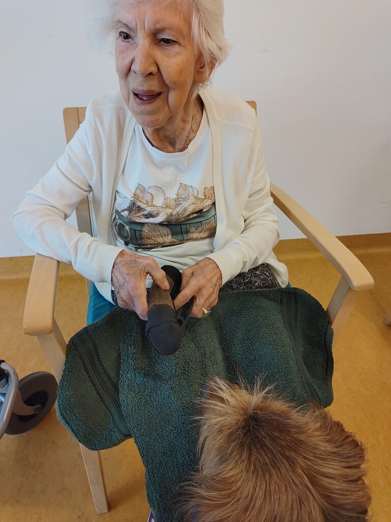 Sie erläuterte auch Ossis vielfältigen Aufgaben einschließlich seiner Ausbildung zur Personensuche. Unsere Bewohner waren deutlich begeistert und hatten viel Spaß mit dem liebenswerten und haarigen Besucher.