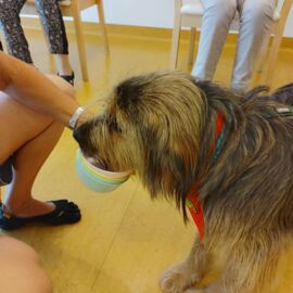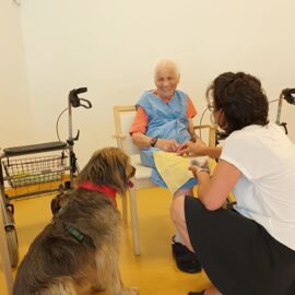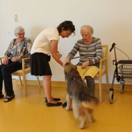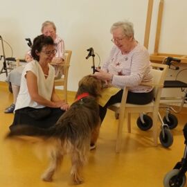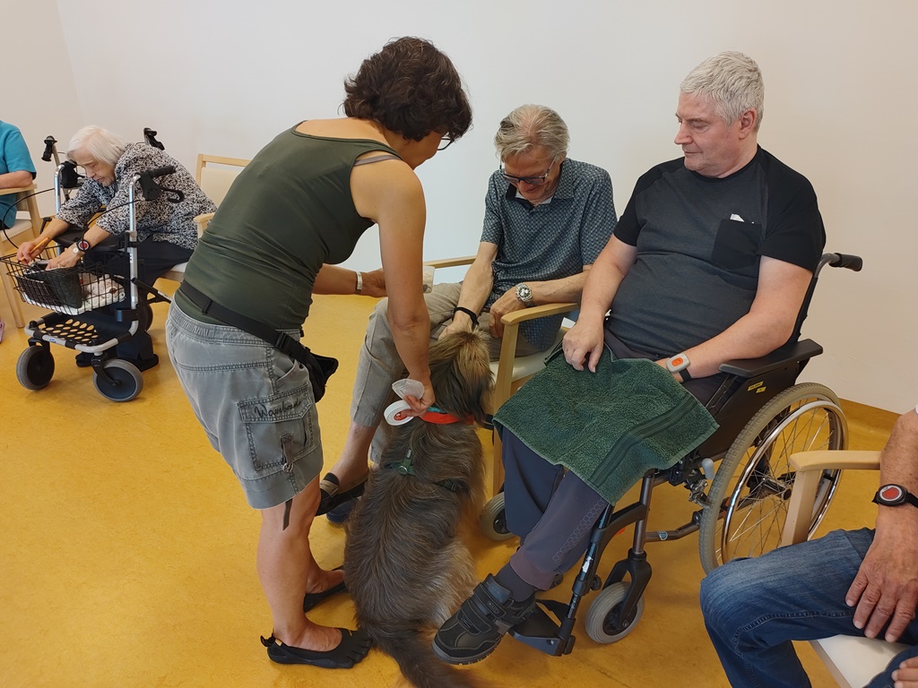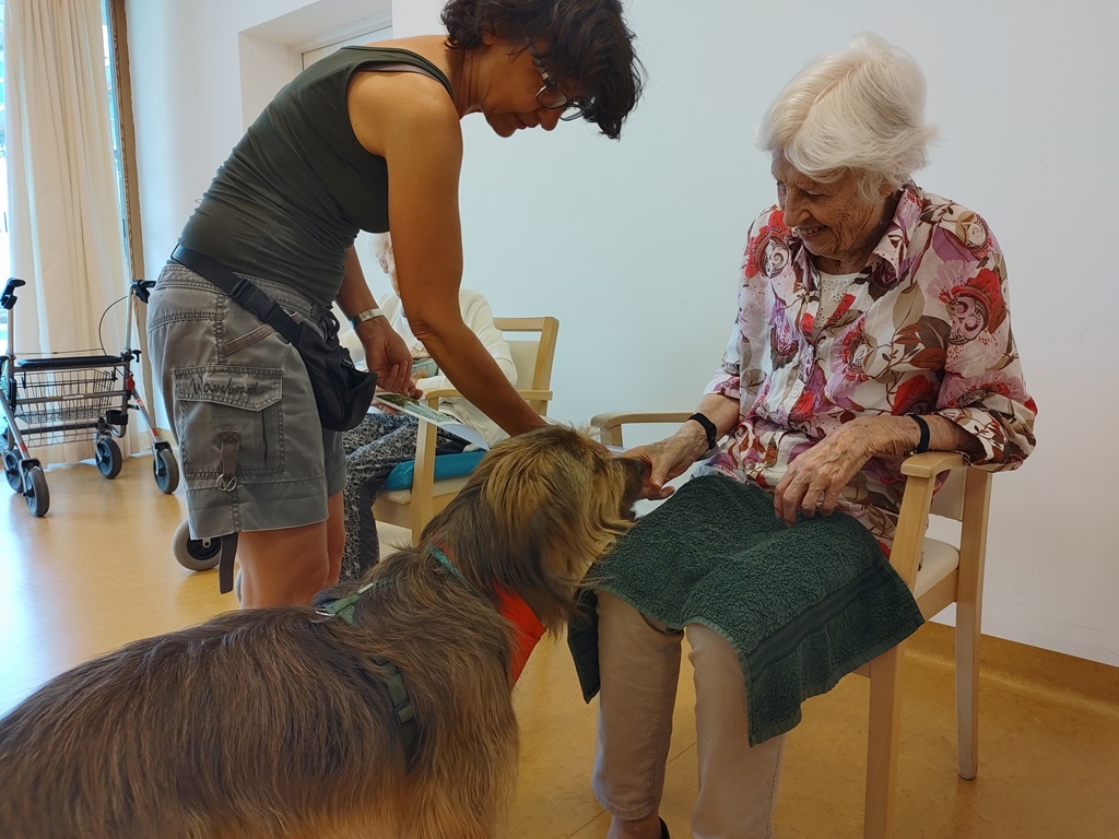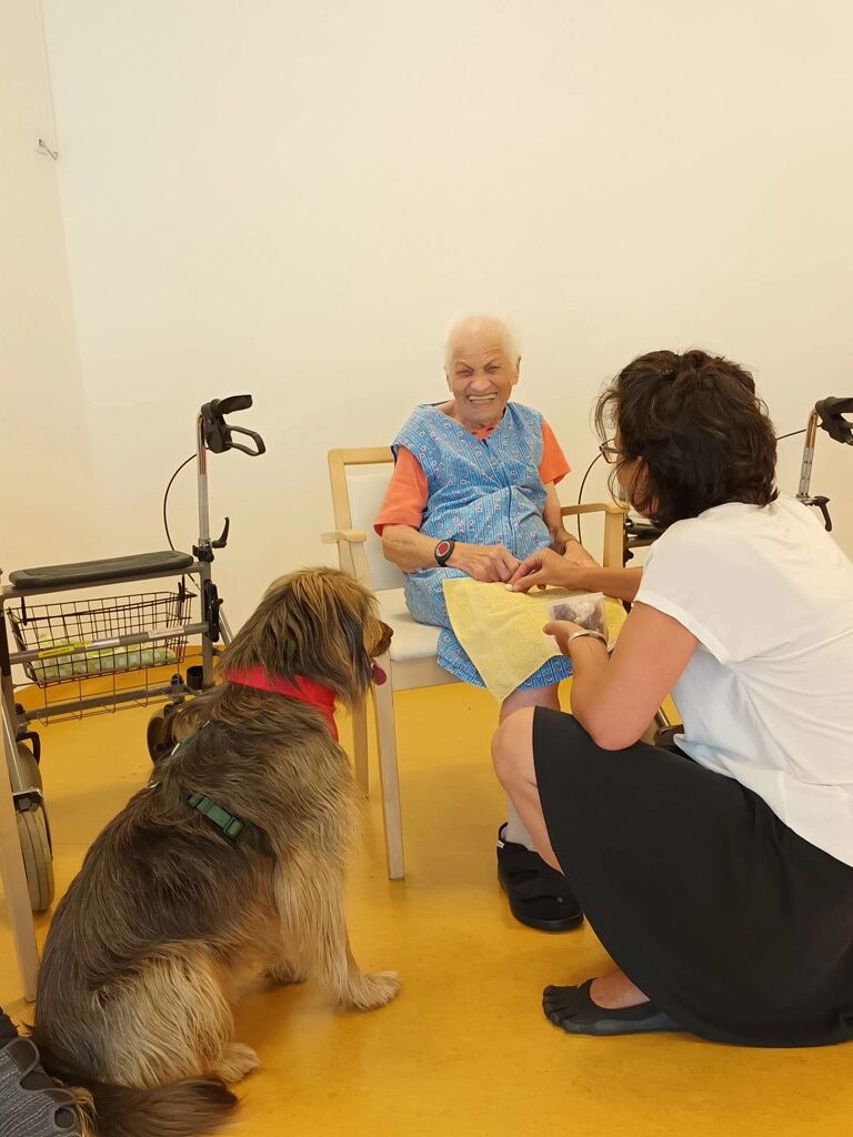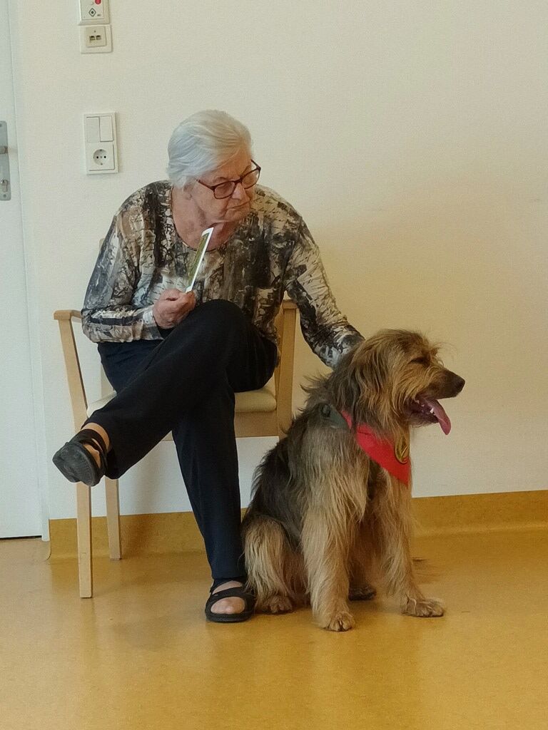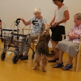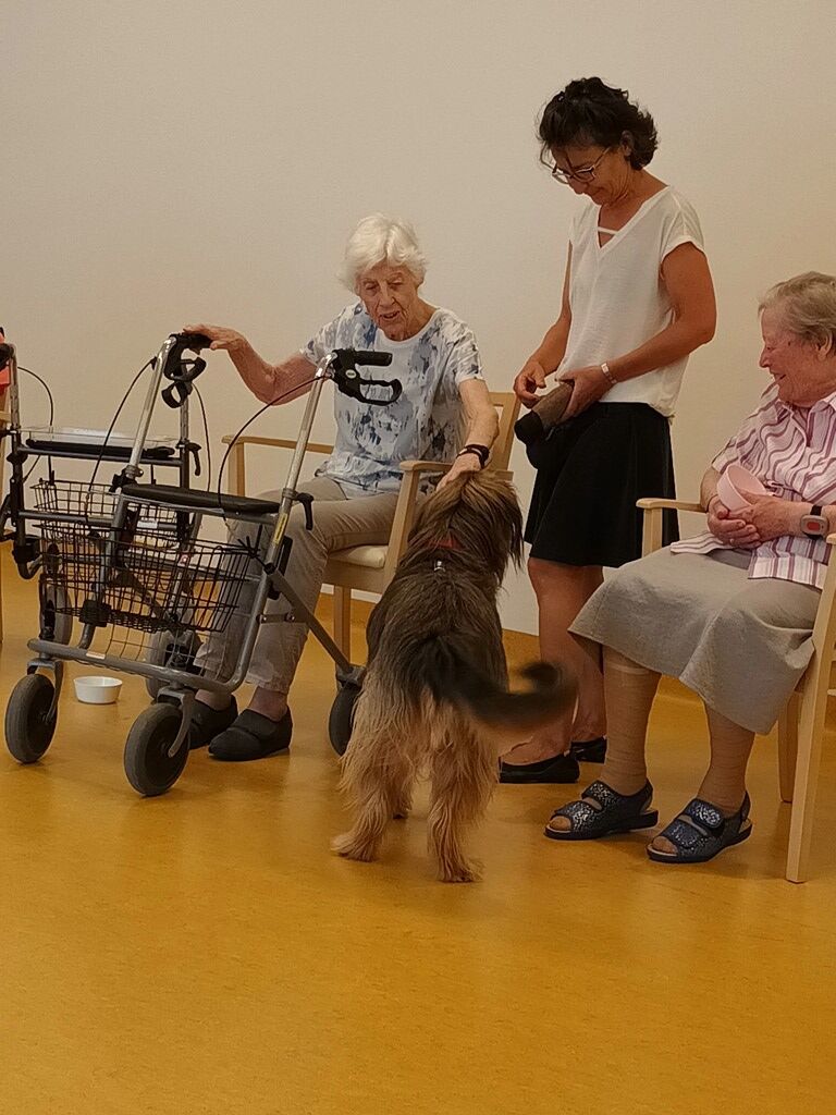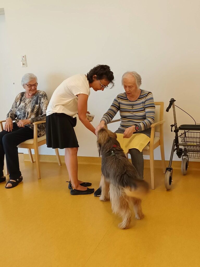 An zwei Nachmittagen hatten unsere Bewohner die Gelegenheit, den Therapiehund Ossi kennenzulernen. Seine Trainerin und „Frauerl“, Frau Claudia Demetz, führte mit Ossi verschiedene Kunststücke vor.